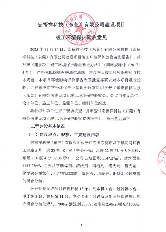 宏福祥科技(东莞)有限公司建设项目验收意见