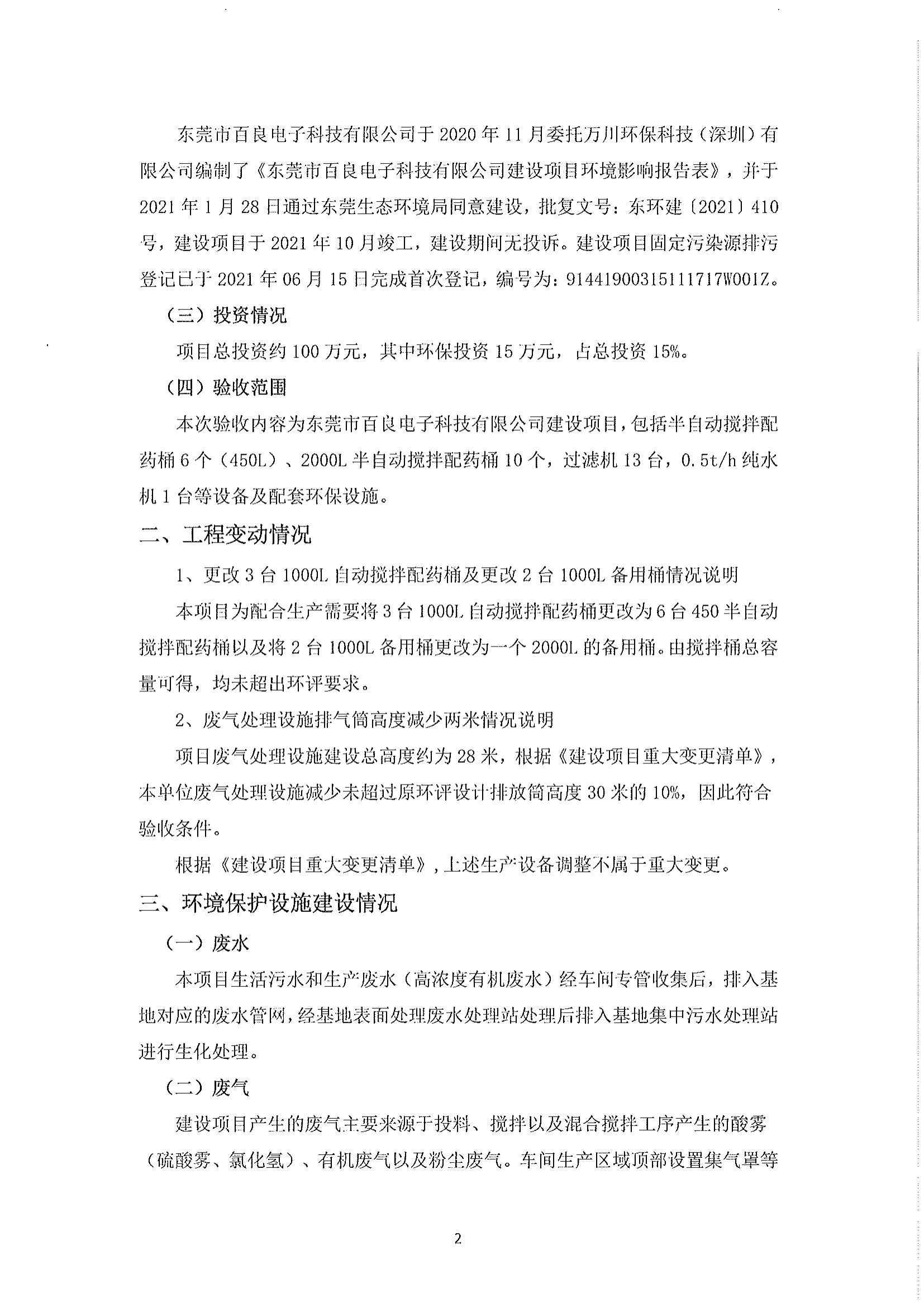 东莞市百良电子科技有限公司建设项目竣工环境保护验收意见