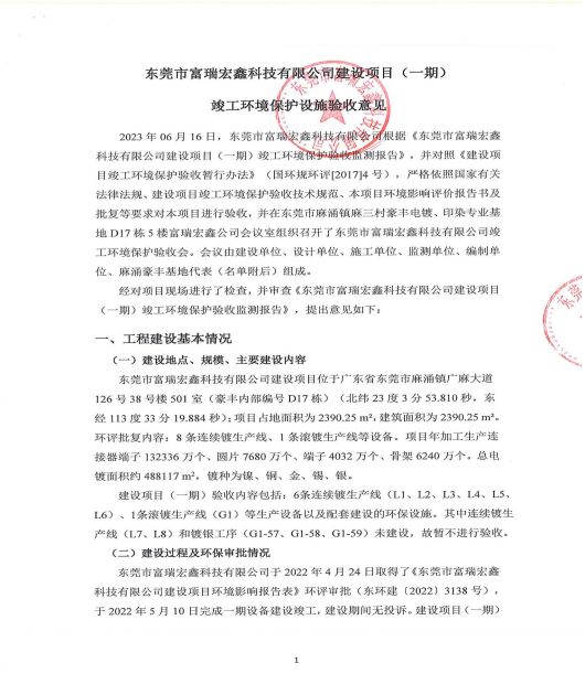 东莞市富瑞宏鑫科技有限公司(一期)验收意见
